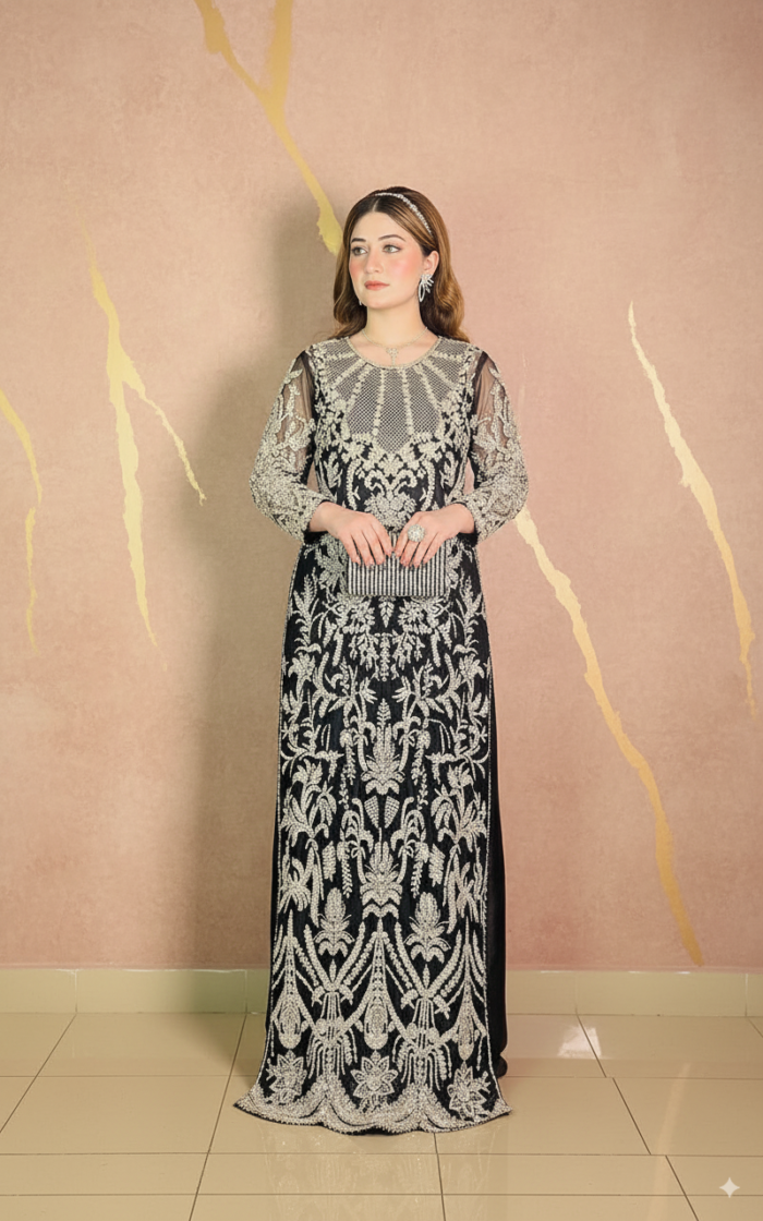 Command attention in this majistic enesemble, a celebration of timeless elegance with a dramatic edge. The outfit features hand embellished organza panels with scalloped detailing, elevated by intricate embroidery and refined borders that exude luxury. Paired with korean rawsilk bottom and sophisticated dupatta. The design is further accentuated with delicate silver sequin spray and luminous statement perfect for evening festivities.