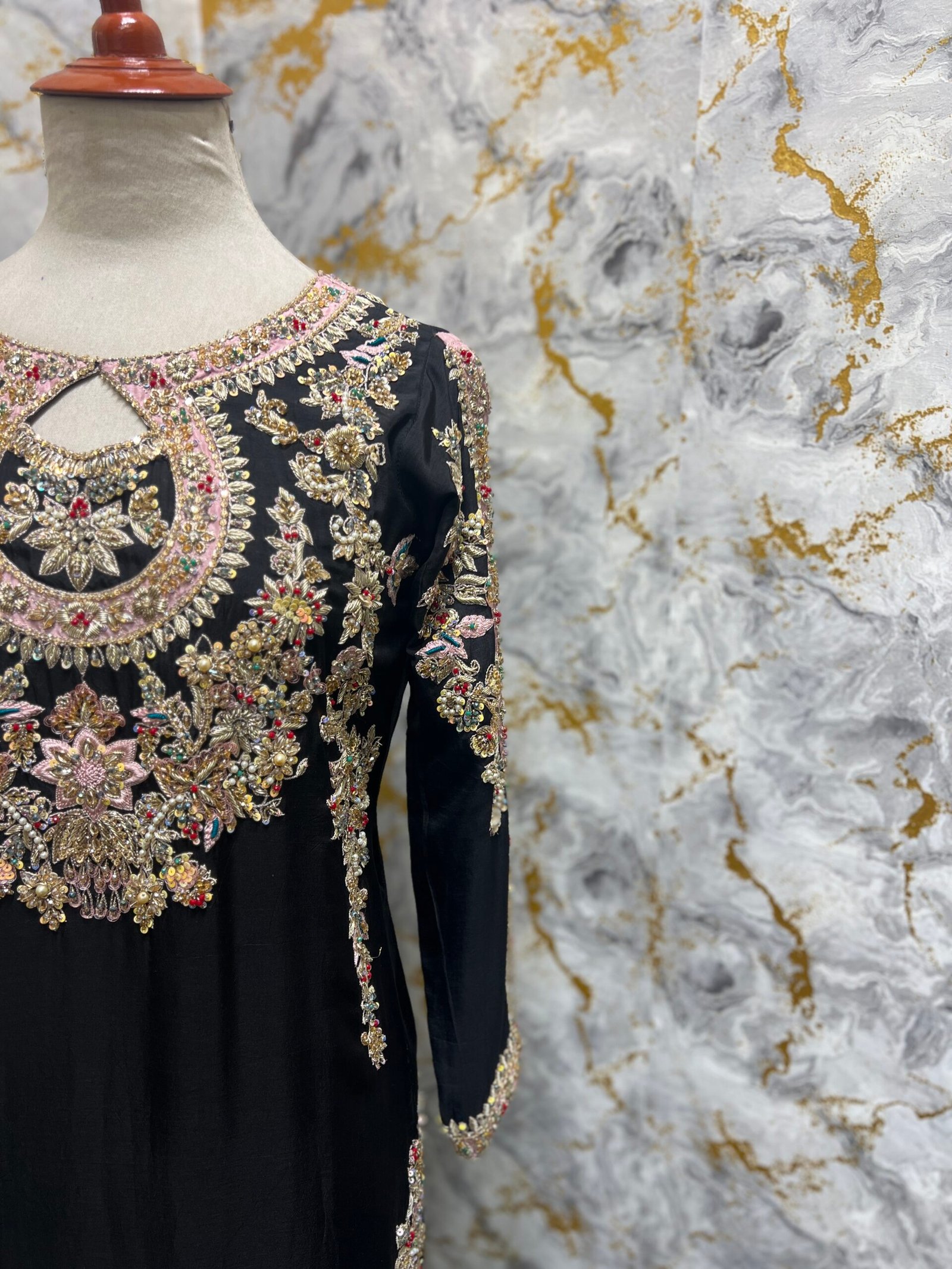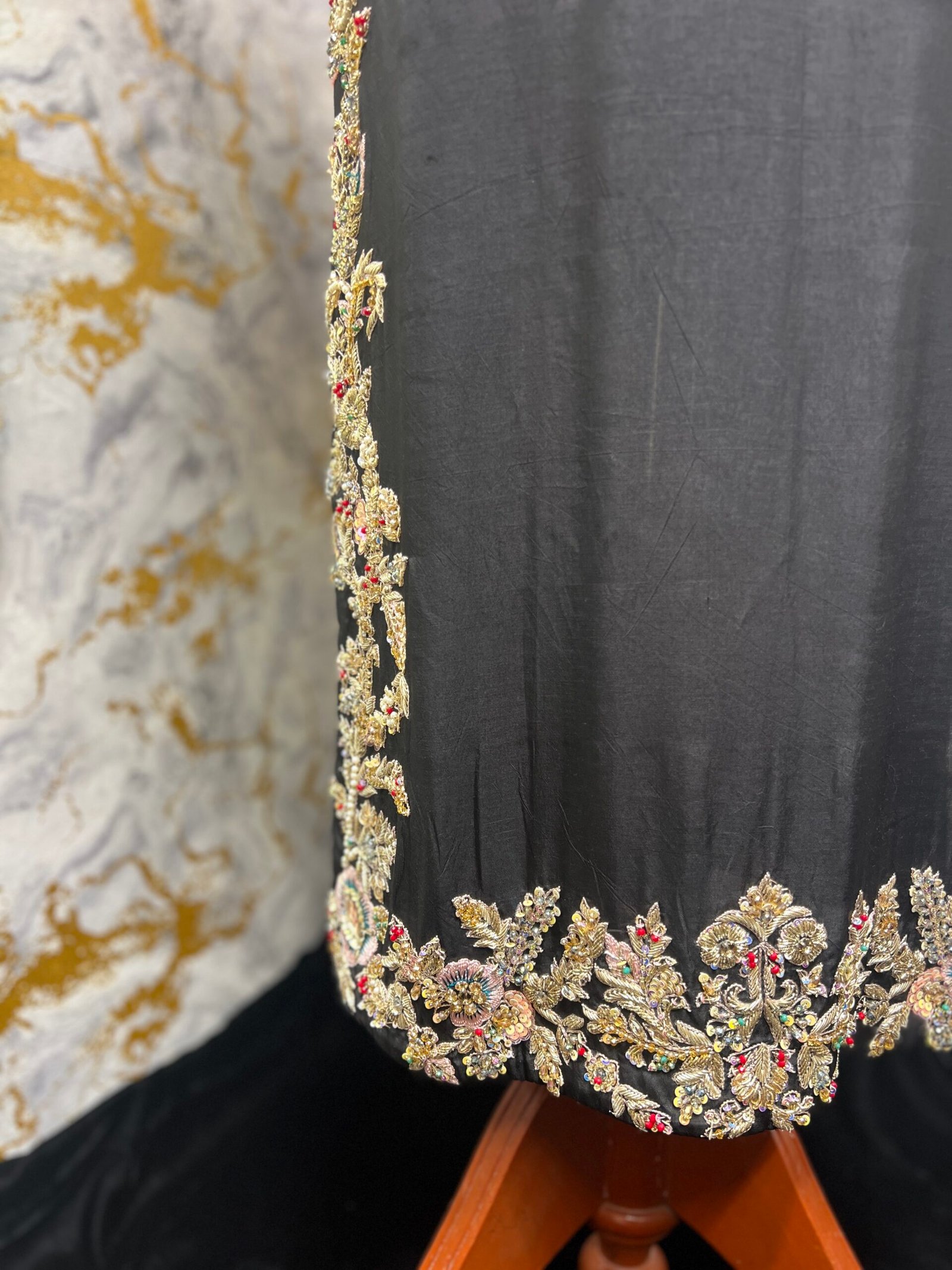 A deep, dark, romantic ensemble. Cut from pure exclusively tussel silk, with an intricately hand embellished neckline and sleeves. Delicate border adorn at the sideline of the shirt along with a delicate border on the daaman and sleeves. The irresistible combination of striking black, gold,pink and zinc with the occasional touch of silver is sure to make you stand apart from the crowd with effortless style.