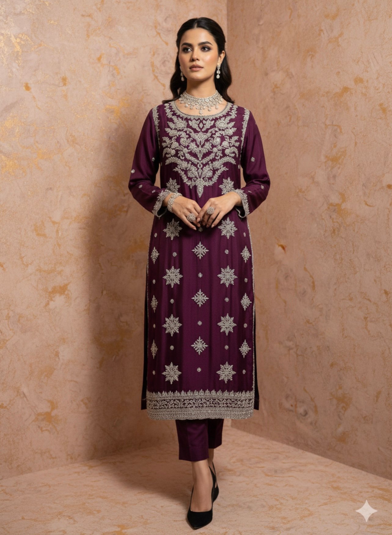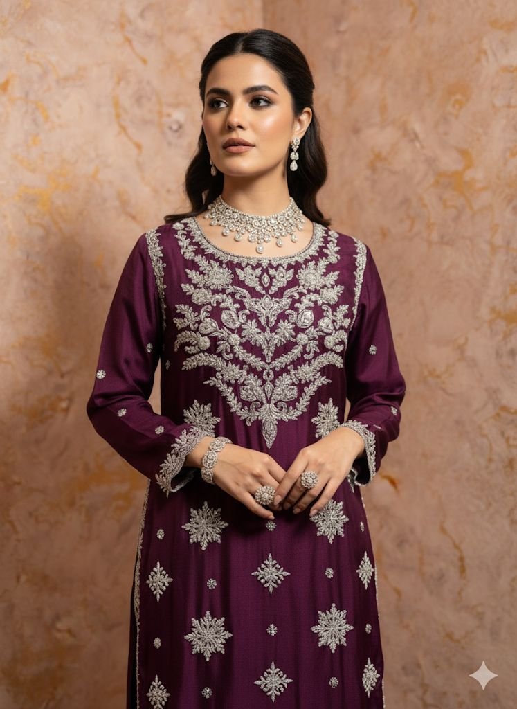 Step into a world of enchantement with our exquisite purple embroidered dress. This stunning tussel silk shirt features a breathless design that drapes gracefully highlighting its intricate hand work. The dress showcases a blend of floral and geometric patterns, crafted to create a truly captivating look. The rich purple colour of the fabric provides a regal touch while the silver embellishment adds sophistication, paired with korean rawsilk trouser and a net dupatta with boti spray on it and having four sided finish. Perfect for special events to hold confidence and glamor both.