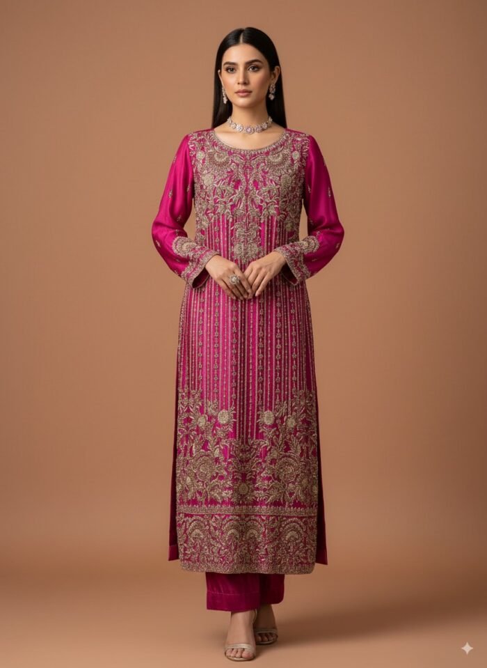Turn heads with this stunning hot pink formal dress, beautifully adorned with intricate gold and silver embroidery that cascades down the entire length of the dress. Crafted on rich fabric with a flowing straight-cut silhouette, it features detailed floral and linear motifs, giving it a regal and timeless charm. The full-length design is complemented by delicately embroidered sleeves and a modest round neckline, making it a perfect choice for weddings, formal evenings, or festive occasions. Pair it with statement jewelry and heels for a complete elegant look.