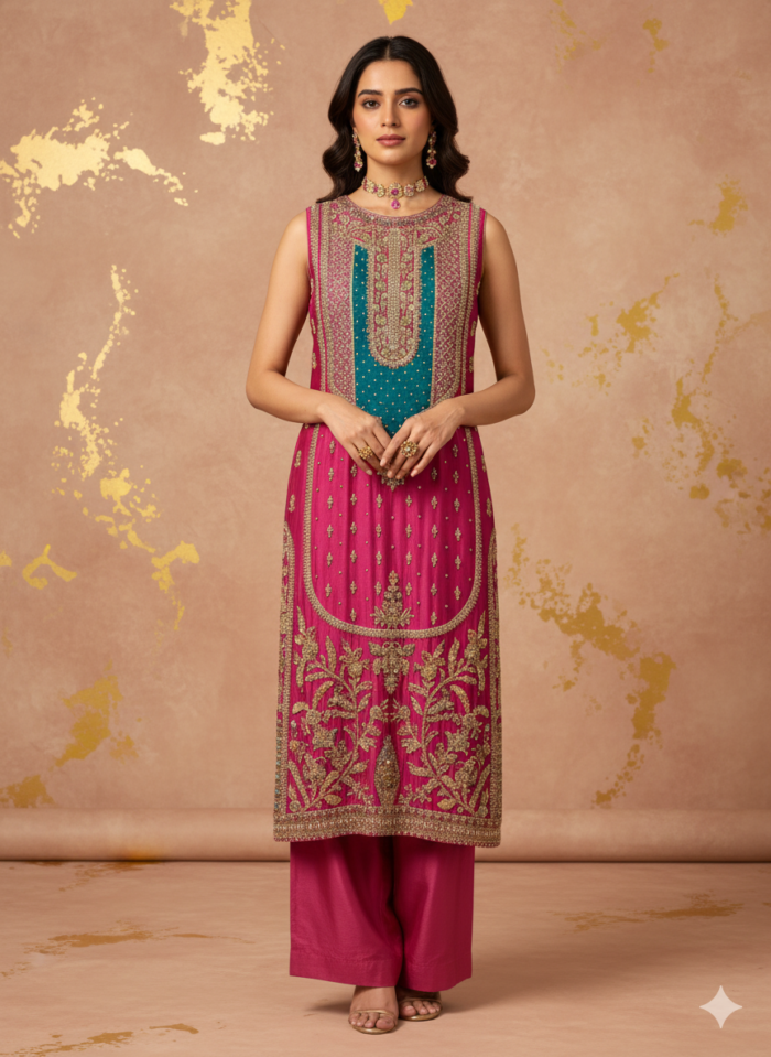 This tissue silk formal shirt is a vision of sophistication, with a delicate pink and teal green base that serves as a canvas for the heavily embellished with hand work Naqshi dabka pearls crystals. Gold and silver embellishments dance across the fabric. The design appears to be inspired by traditional motifs. The neckline is embellished with a delicate pattern. This two piece is paired with a beautiful Swarovski net dupatta along tissue finishing, making the three piece perfect ensemble for special occasions.