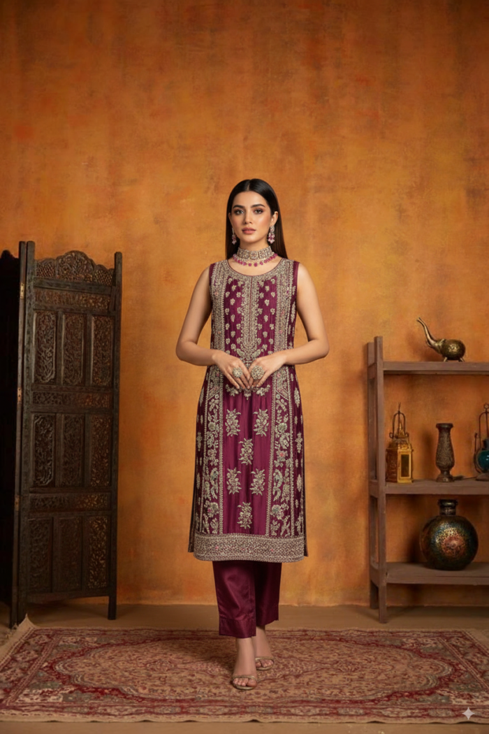Rendered in a soothing shade of maroon features long tissue silk shirt. Shirt is fully embellished with a bold modern floral jaal along with heavy and chunky borders on ghera and on side slits. These patterns are likely created using intricate embr0idery techniques with threads of gold meticulously stitched onto fabric. The embellishment includes Naqshi, Dabka, Sequins, Beads or Metallic threads. The shirt is paired with Pk korean rawsilk pants further elaborated with net dupatta having four side tissue finishing and booti spray on it enhancing the overall elegance of the dress.