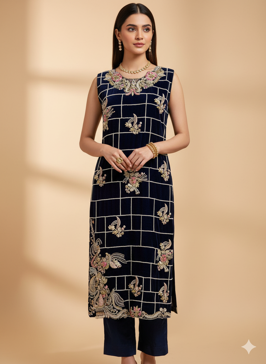Winter festivities are incomplete without the timeless glamour of midnight hued velvet. This luxurious navy blue velvet straight kurti featuring intricate hand embellished details. The neckline showcases delicate floral handwork in soft pink, gold and silver hues, adorned with pearls and sequins. Similar floral motifs dance across the fabric complemented by a unique grid like design. The hemline is heavily adorned with delicate floral embroidery, beads, and sequin work, creating a graceful finish that complements the straight silhouette. Pair it with straight pants or cigarette trousers and minimal jewelry for an effortlessly regal look.