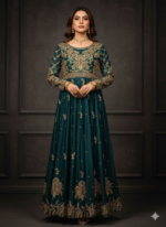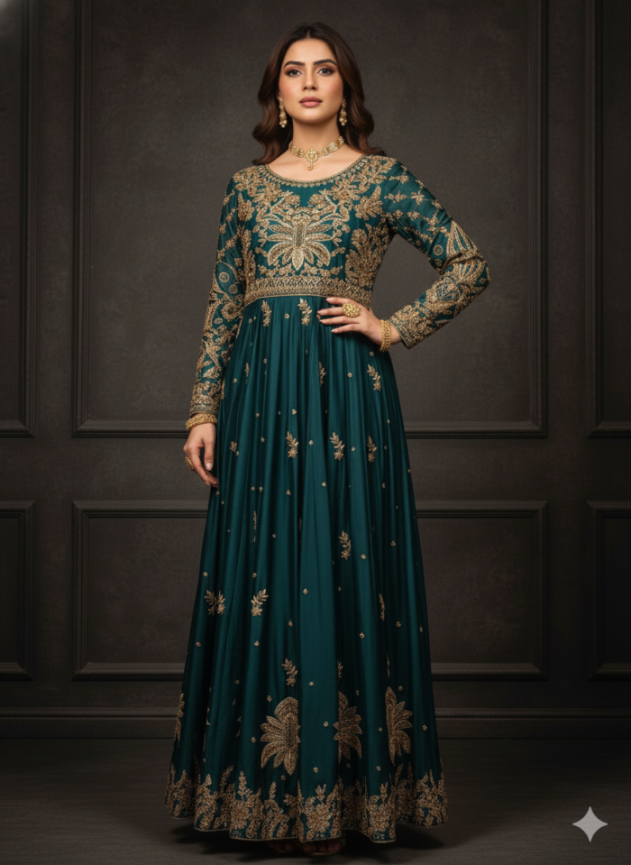 Elevate your festive and wedding season with this rich teal Tissue silk, is a real embodiment of grace. It looks like something from a dream. The dress features exquisite gold embroidery that gracefully adorns the neckline, sleeves and bodice, creating a symphony of shimmer and sophistication. The intricately detailed golden zari and threadwork bodice that exudes regal charm. The long, flowing silhouette is adorned with delicate sequins scattered throughout, the ensemble comes with a matching net dupatta edged with delicate finishing. adding a graceful touch to your look. The richly adorned sleeves and border with floral pattern enhance the luxury feel, transforming your special moments into unforgettable memories.
