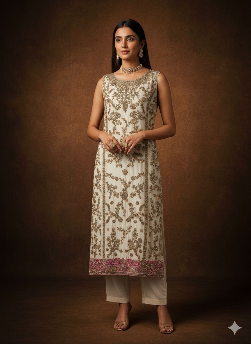Radiating grace and intricate detailing, this tissue silk ensemble stand out as a stunning choice for any occasion. The sleeveless shirt boasts exquisite golden thread and beadwork, featuring intricate design. The meticulous craftsmanship adds a touch of elegance and sophistication to the entire outfit. Accompained by matching korean raw silk pants, Net dupatta with booti spray. Add a subtle touch of refinement. This ensemble promises to make a statement and leave a lasting impression with its beautiful design