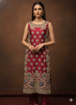 It is a vibrant red, and the entire piece is lavishly embroidered with elaborate floral patterns in gold and turquoise. These patterns adorns the front and sides, creating a rich tapestry of color and texture. The hand embellishments further enhance its allure, featuring intricate stitching, sequins, and crystals that glimmer and sparkle creating a mesmerizing visual appeal. Paired with korean rawsilk pants in a matching shade, completing the ensemble with sophistication and grace. The delicate hand work on the dress is not just decorative elements but true work of art, shimmering and reflecting light to capture attention and admiration.