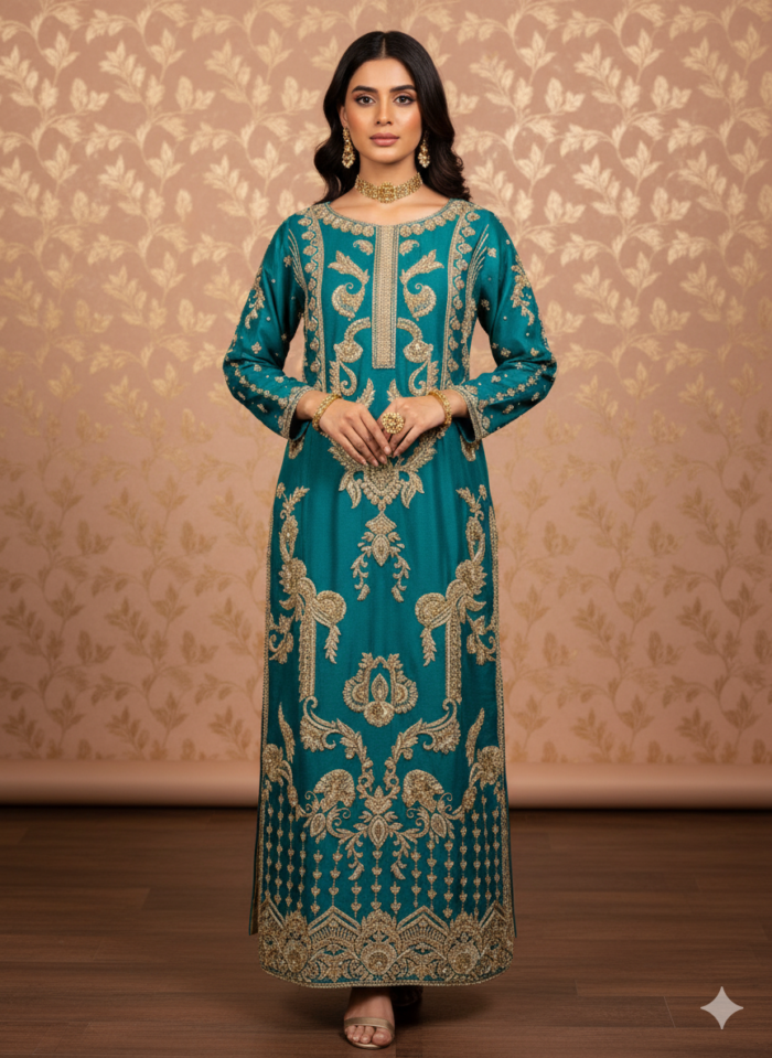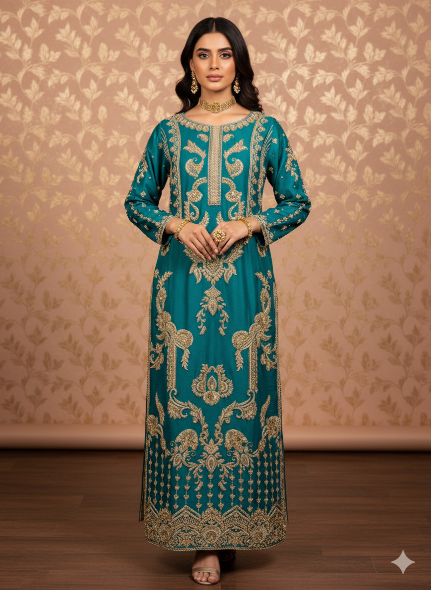 Elegant teal-green traditional dress adorned with intricate gold embroidery and embellishments that shimmers and catches the light, creating a captivating effect. The flowing silhouette offers a graceful and flattering fit, perfect for your occasions. The cotton net shirt featuring ornate motifs and a decorated neckline, cuffs and hem, paired with korean rawsilk pants and a net dupatta four side finished ensuring a luxurious feel and timeless appeal. A perfect choice foe your festive or formals occasions offering a blend sophistication and glamour that will ensure you stand out.