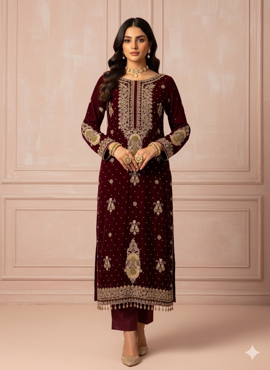 Make a statement on any formal occasion with this stunning three piece maroon velvet dress. The shirt features intricate embroidery and crystal work that adds a touch of elegance to your attire. The rich, deep maroon hue of the velvet fabric adds a touch of opulance, while the detailed embellishments provide a stunning contrast. The gold embellishment elaborate patterns and the crystal work adds subtle shimmer, enhancing the dress’s overall feel. The velvet shirt paired with velvet pants or korean rawsilk pants according your comfort state along with net dupatta four side finished and spray on it.